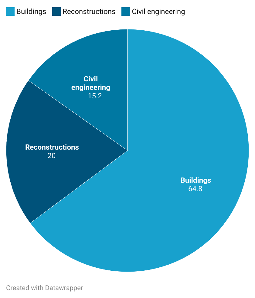 Of the total number of issued building permits, 289 (64.8 %) are for buildings, 68 (15.2 %) are for civil engineering structures, and 89 (20.0 %) are for reconstructions.
