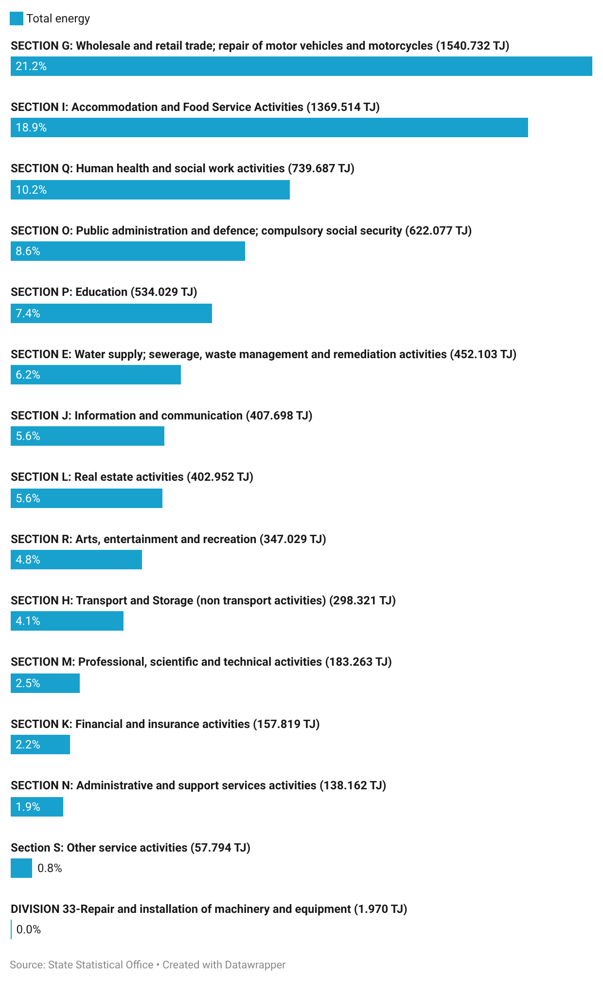 According to the economic activities classified under NACE Rev.2, the highest consumption was recorded in Wholesale and Retail Trade (1 540.732 TJ), Accommodation and Food Service Activities (1 369.514 TJ), Human Health and Social Work Activities (739.687 TJ), and Public Administration and Defence (622.077 TJ).