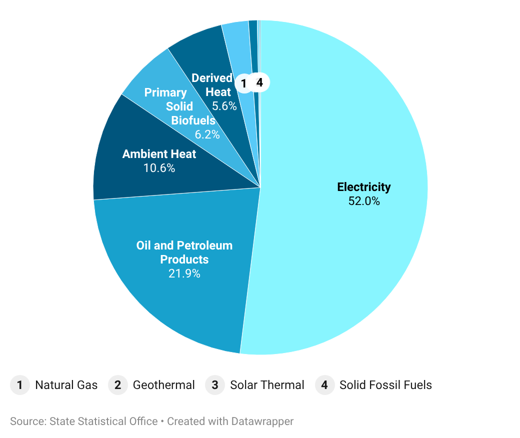 Biomass accounts for 6.2%, district heat for 5.6%, and natural gas for 2.6%. Geothermal and solar thermal energy, together with lignite, account for 1.2% of total final consumption.