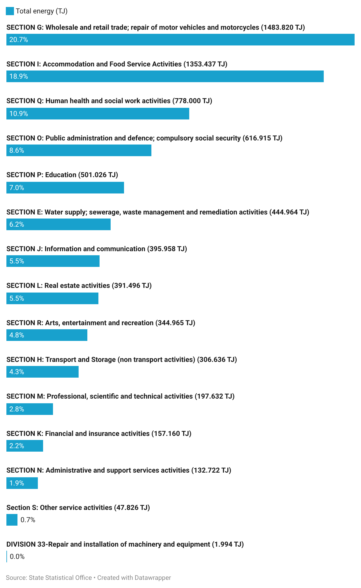 Final energy consumption in the service sectors in 2024 amounted to 7 154.551 TJ. According to economic activities classified by the National Classification of Activities (NACE Rev. 2), the highest energy consumption was recorded in the following sectors:
