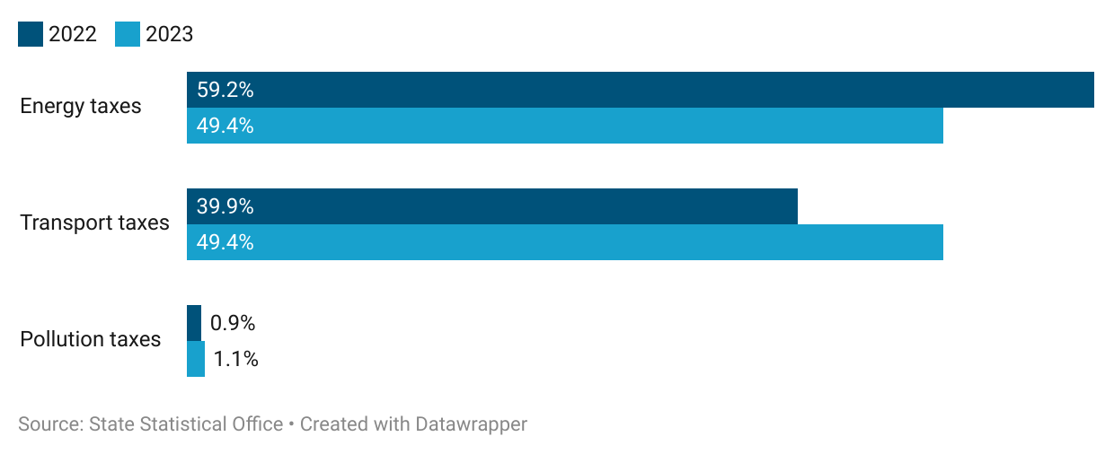 In 2023, energy taxes and transport taxes had an equal share in environmental taxes with 49.4% each, followed by pollution taxes with 1.1%.