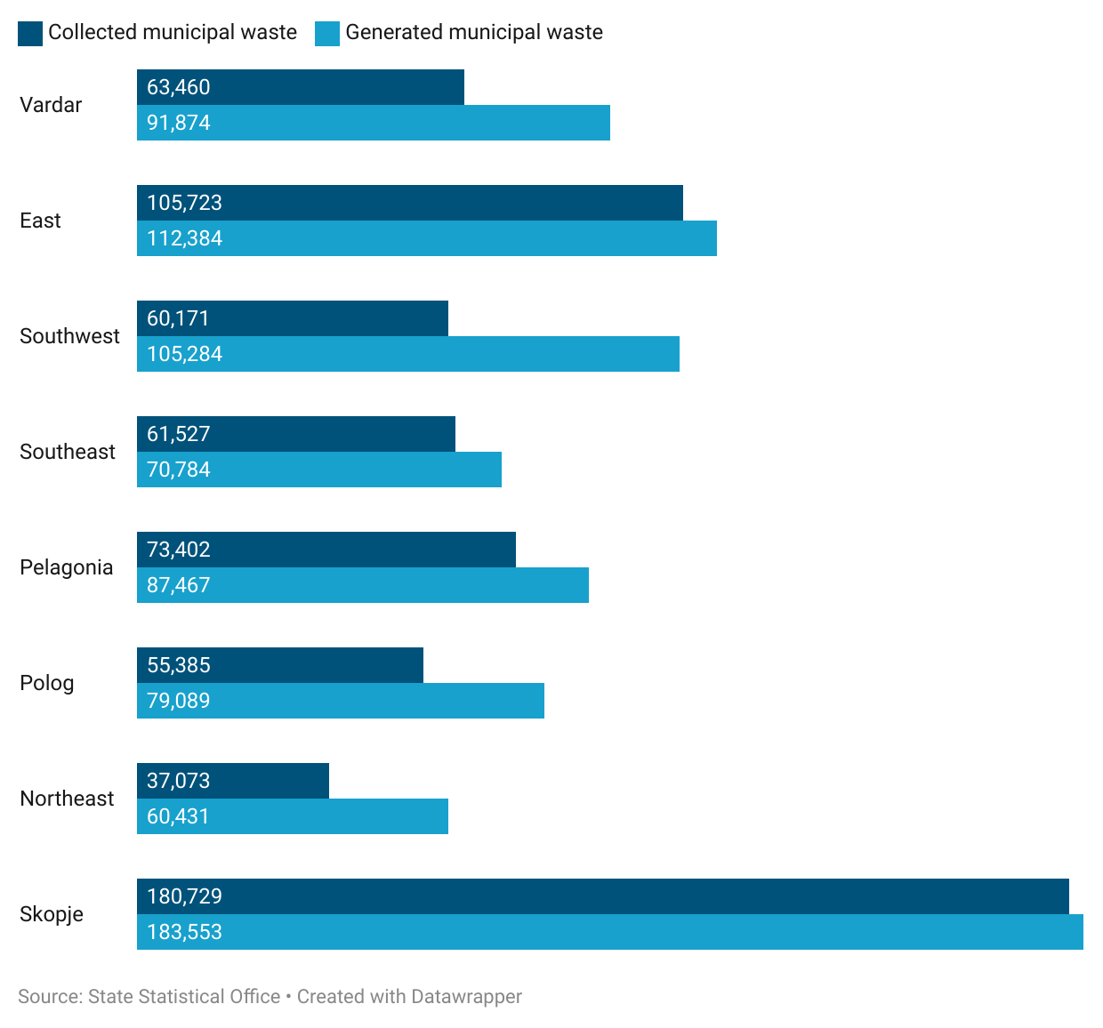 The highest amount of collected municipal waste was registered in the Skopje Region - 180 729 tonnes or 28.4% of the total collected amount in the Republic of North Macedonia. Of the total amount of collected municipal waste, 535 606 tonnes or 84% were collected from households, and the remaining 16% from legal and natural persons (commercial waste).