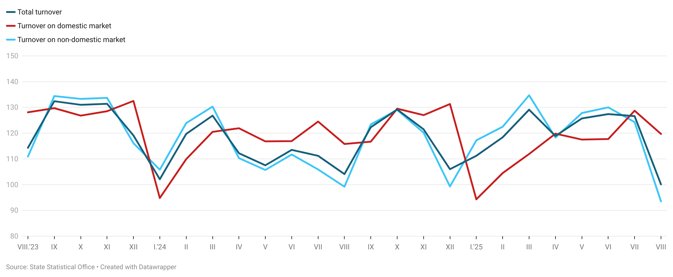 The turnover in industry, total, in August 2025 decreased by 3.9% in comparison with August 2024