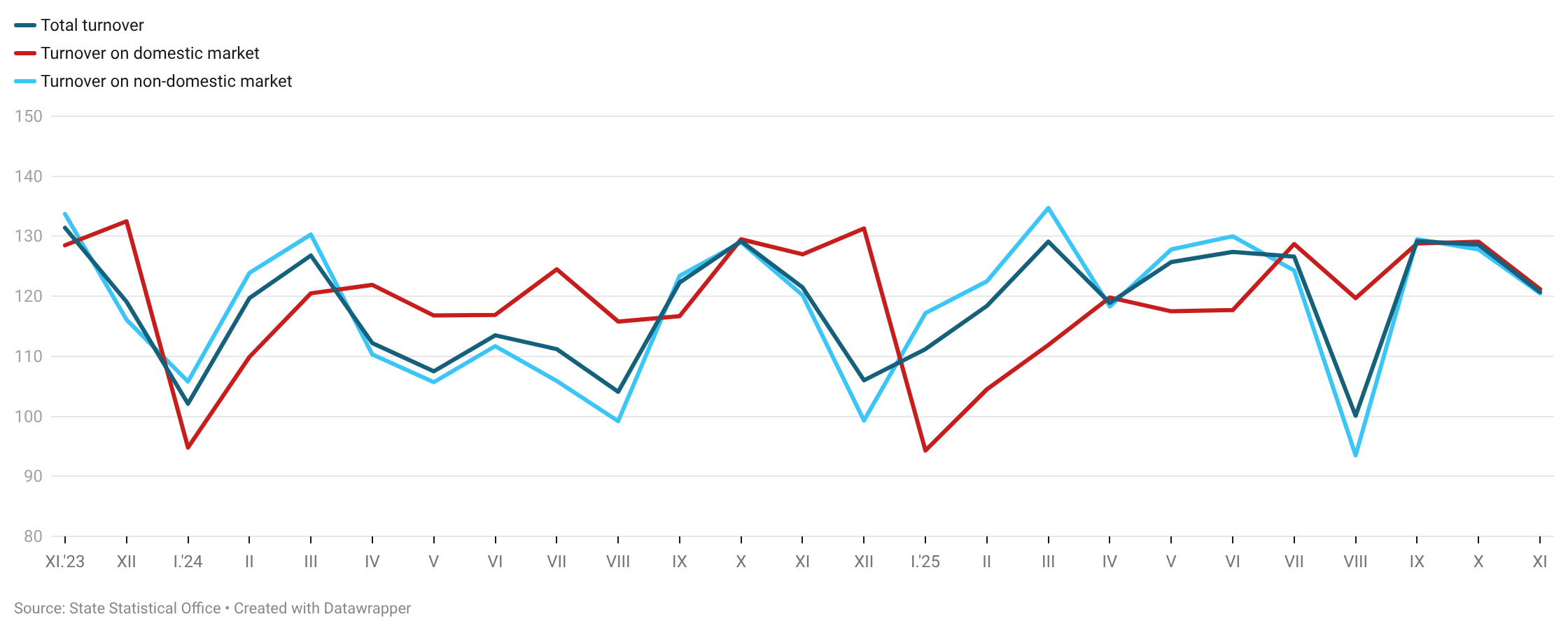 The turnover in industry, total, in November 2025 decreased by 0.7% in comparison with November 2024