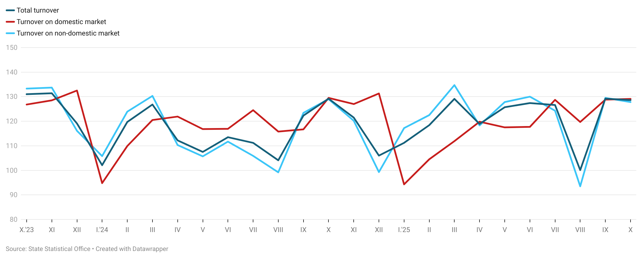 The turnover in industry, total, in October 2025 decreased by 0.4% in comparison with October 2024