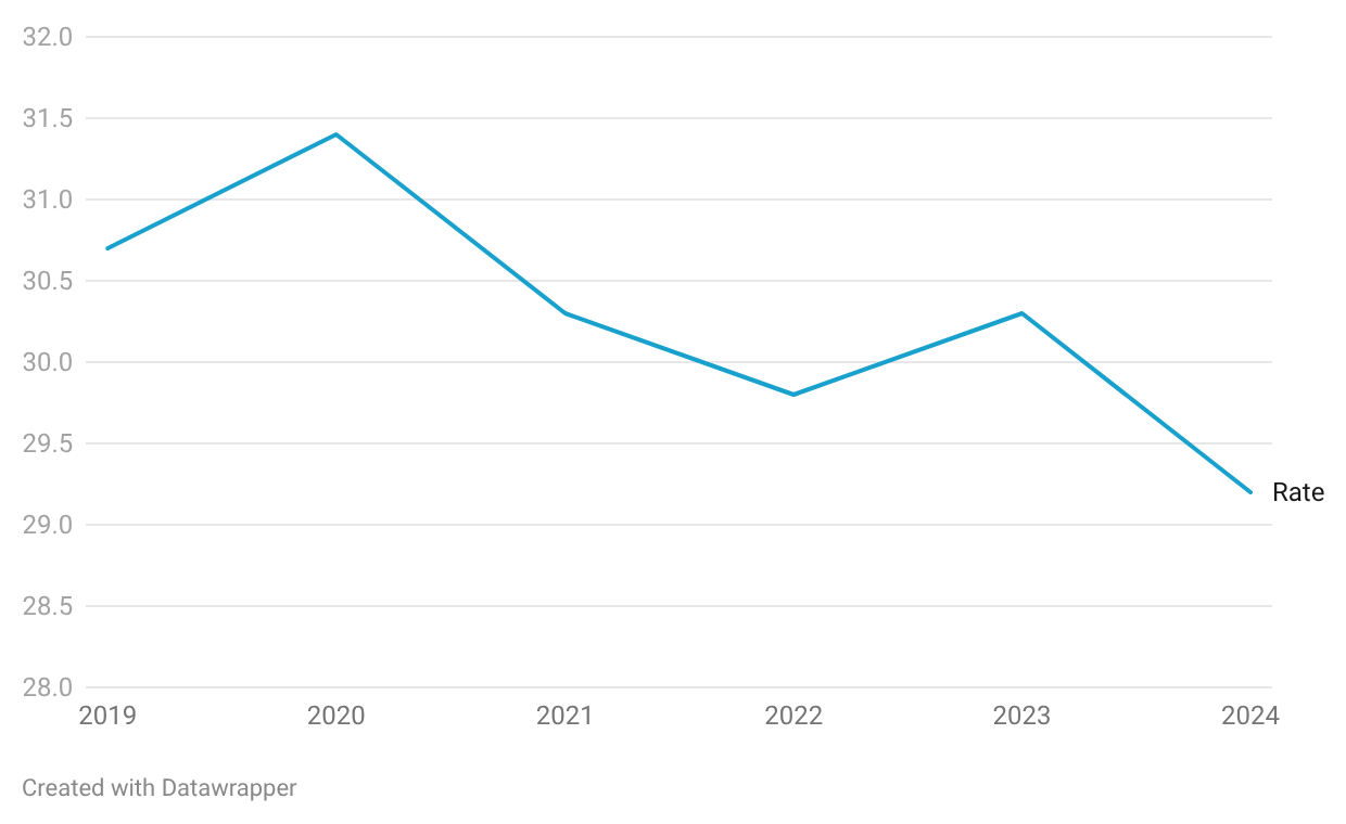 Analysed by household types, the at-risk-of-poverty rate in households of two adults with two dependent children in 2024 was 17.1%. According to the most frequent activity status, the at-risk-of-poverty rate for employed persons was 7.9%, while for pensioners it was 12.0%. The Gini coefficient (measure of income distribution inequality) was 29.2%.