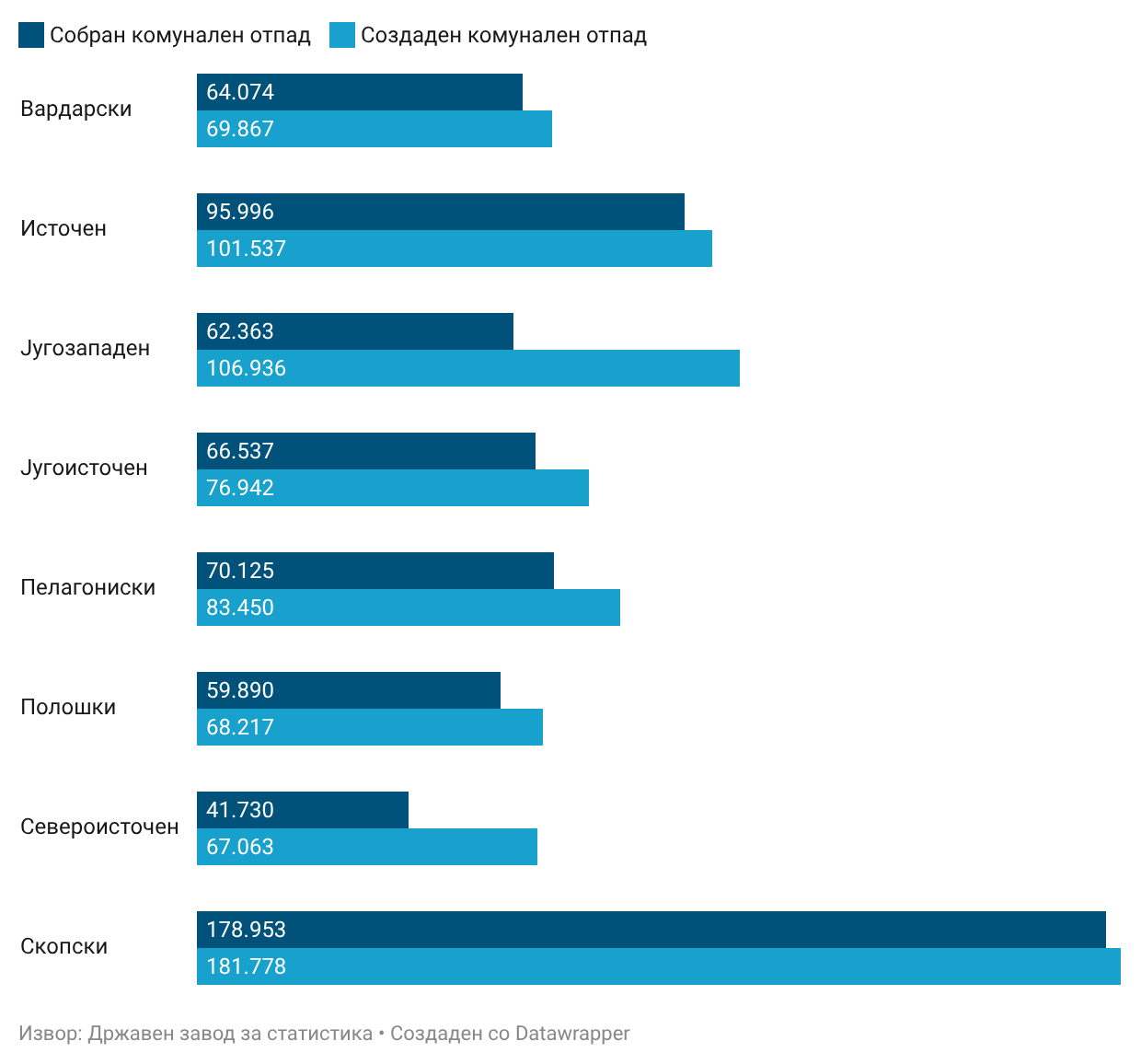 Најголемо количество собран комунален отпад е забележано во Скопскиот Регион – 178 953 тони или 28.0 % од вкупното собрано количество. Од вкупното количество собран комунален отпад,