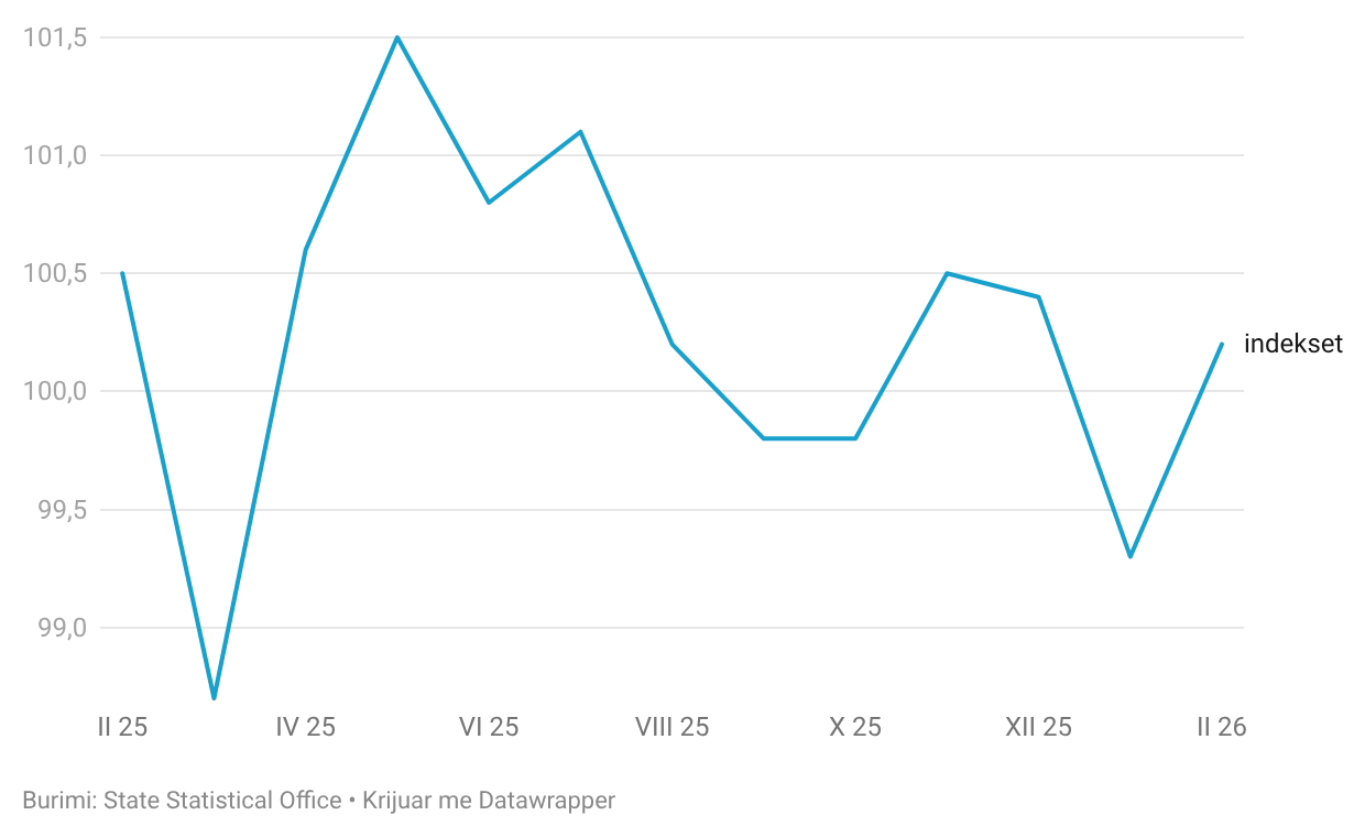 Indeksi i kostos për jetesë në muajin shkurt të vitit 2026, krahasuar me muajin shkurt të vitit 2025, shënoi rritje prej 2.9%, dhe indeksi i çmimeve me pakicë shënoi rritje prej 1.6%.