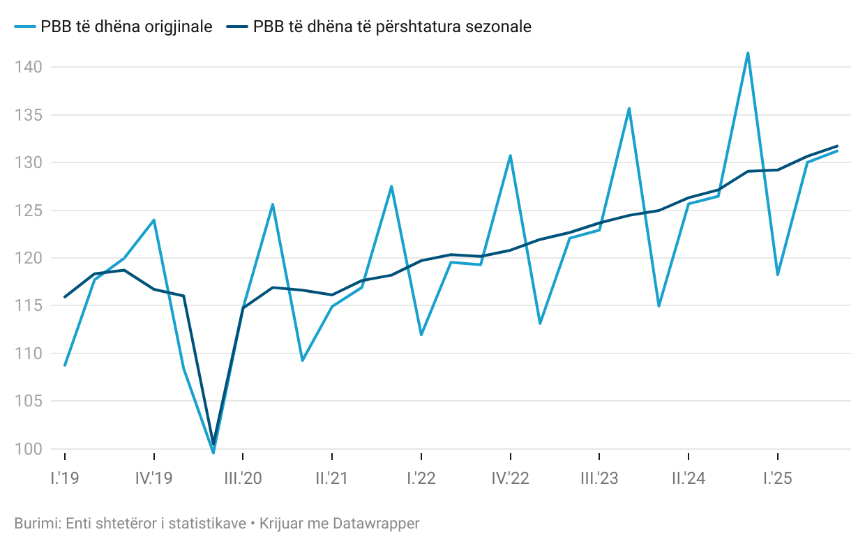Sipas të dhënave të përshtatura sezonale dhe kalendarike, norma e rritjes së prodhimit të brendshëm bruto në tremujorin e tretë të vitit 2025 krahasuar me tremujorin e tretë të vitit 2024 është 3.6%.