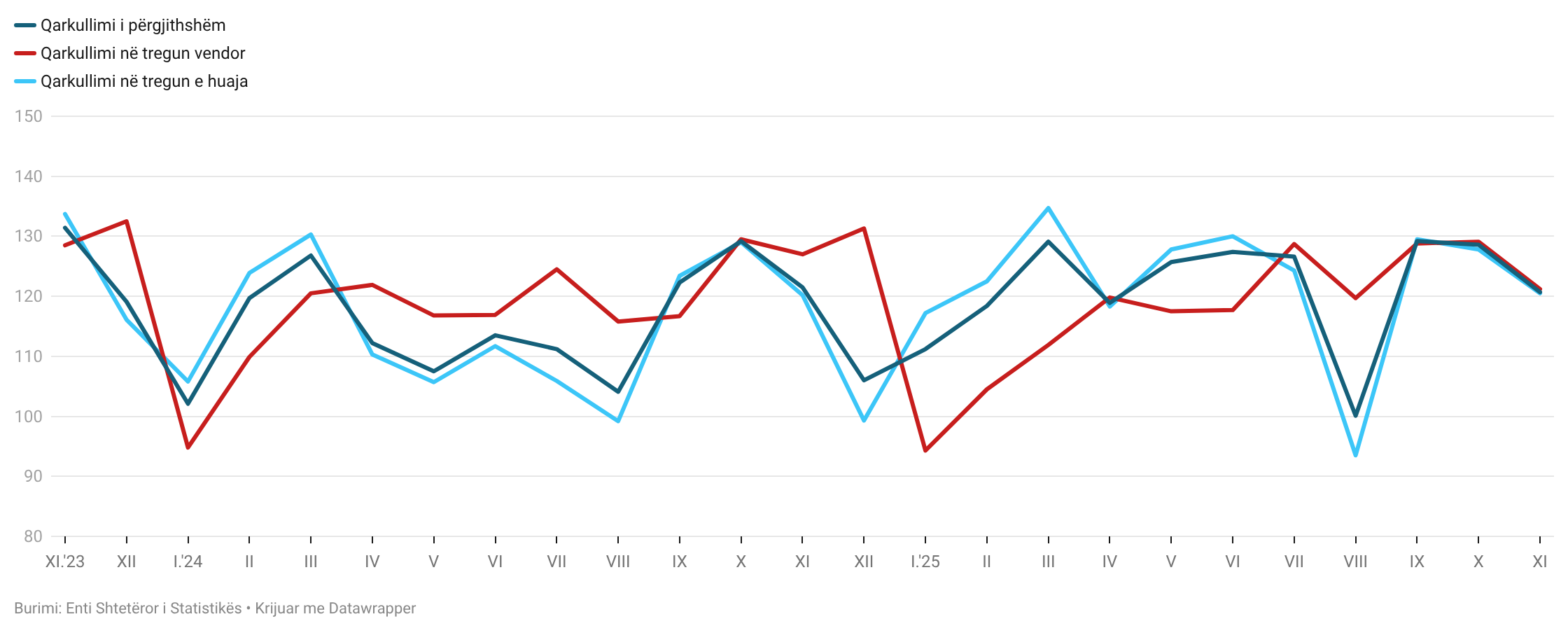 Qarkullimi në industri në tregun vendor në muajin nëntor të vitit 2025, në krahasim me muajin nëntor të vitit 2024, vërehet rënie nga 4.5% , derisa në periudhën janar- nëntortë vitit 2025, krahasuar me periudhën janar- nëntor të vitit2024 vërehet rënie nga 0.1%.