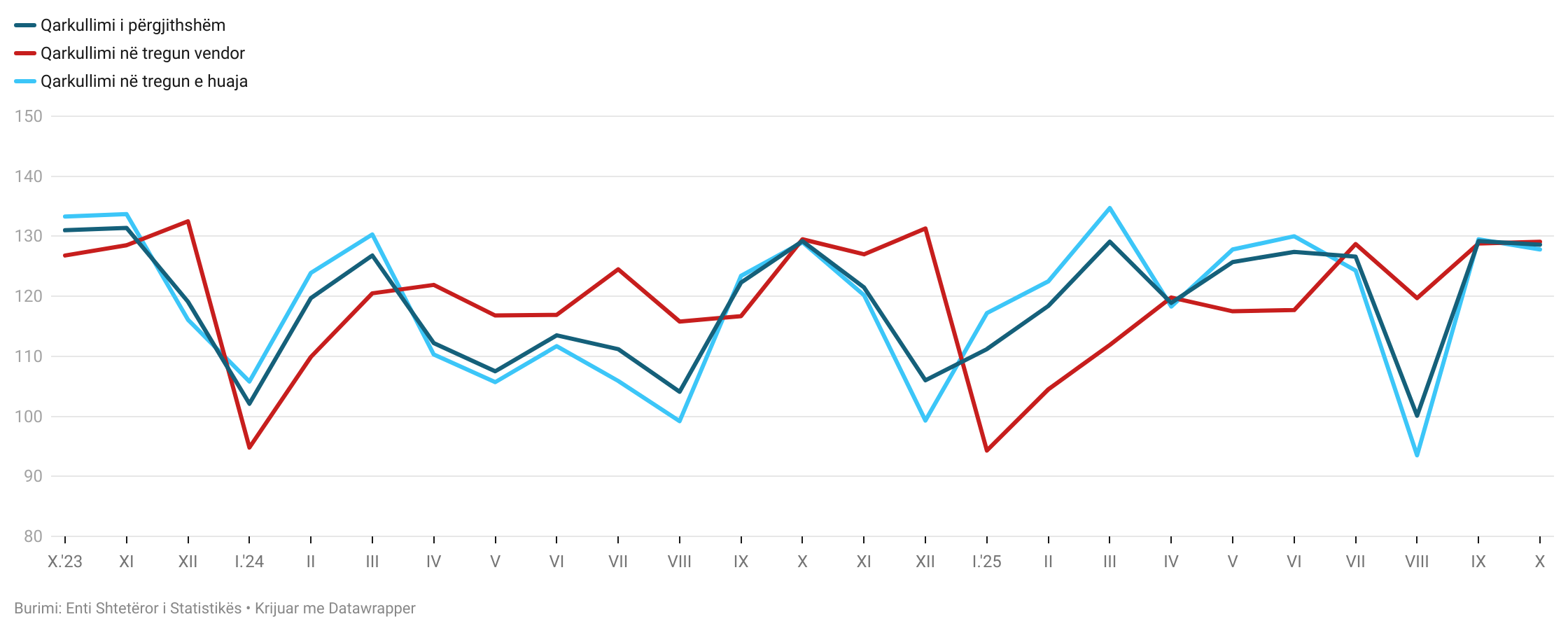 Qarkullimi në industri në tregun vendor në muajin tetor të vitit 2025, në krahasim me muajin tetor të vitit 2024, vërehet rënie nga 0.3% , derisa në periudhën janar- tetor të vitit 2025, krahasuar me periudhën janar- tetor 2024 vërehet rritje nga 0.4%.